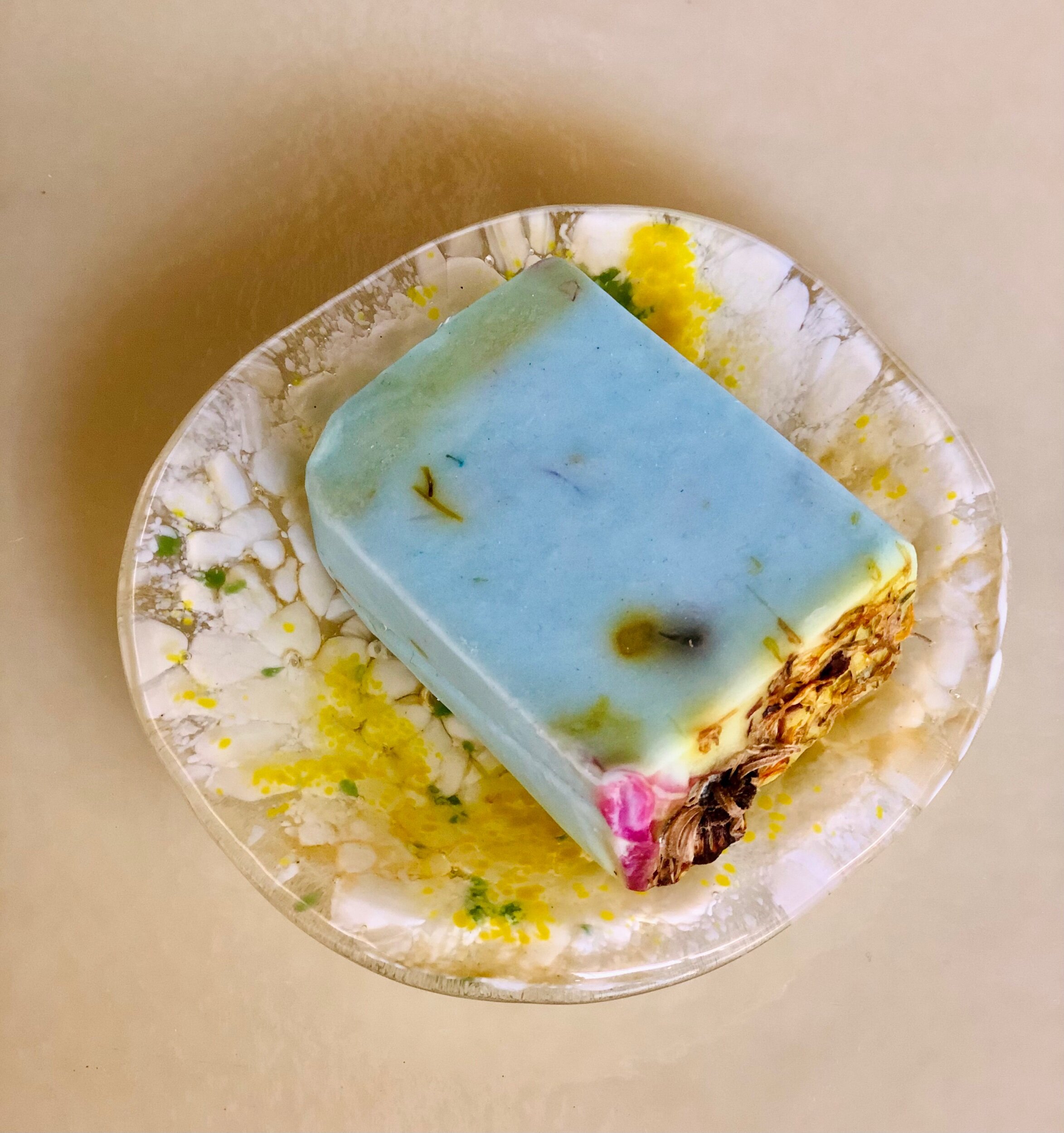 This one of a kind yellow ring/ soap dish starts with a clear glass sheet; yellow and white glass pebbles are added to the top and white and green at the bottom. Once it’s fused, it is cut, sanded and fused again to shape.