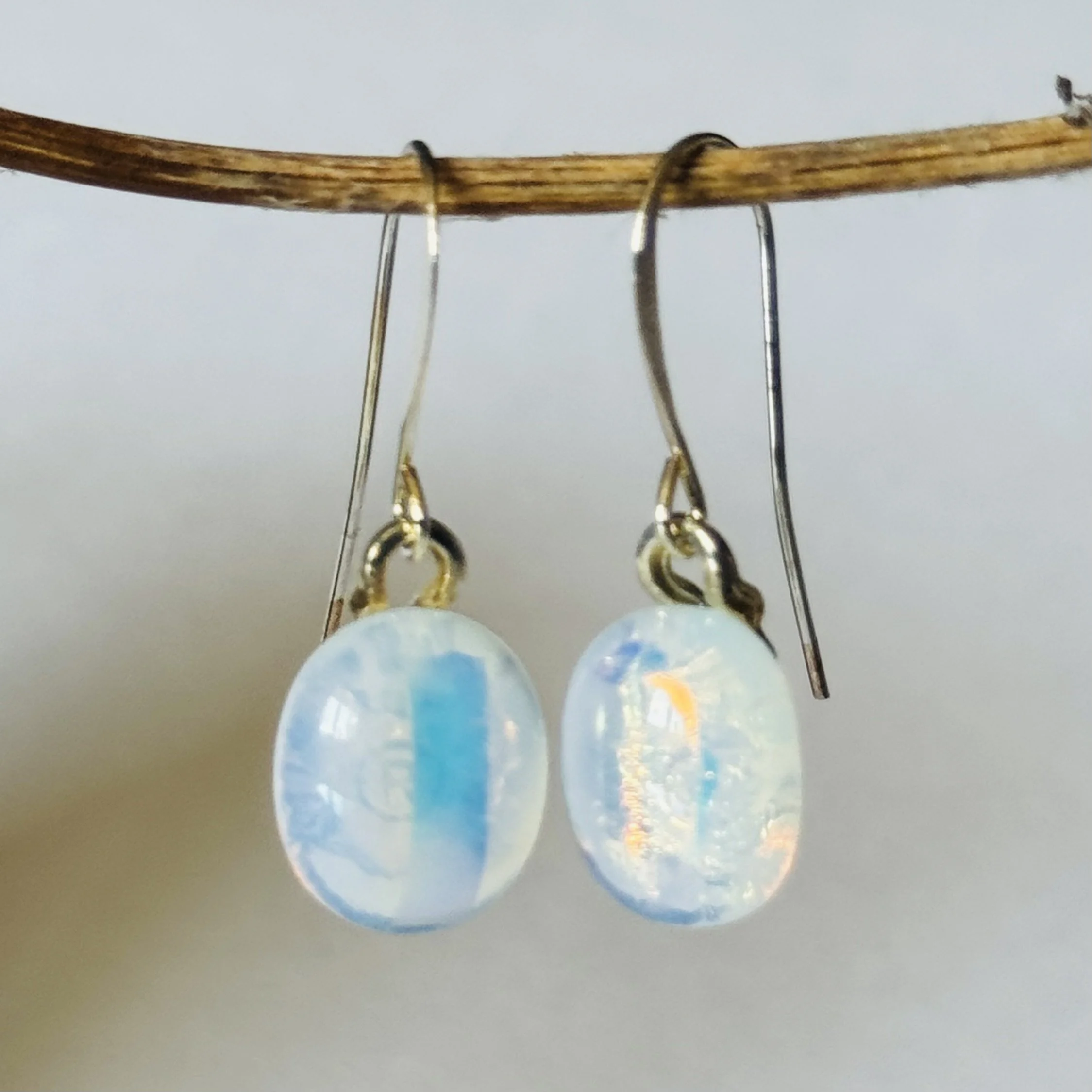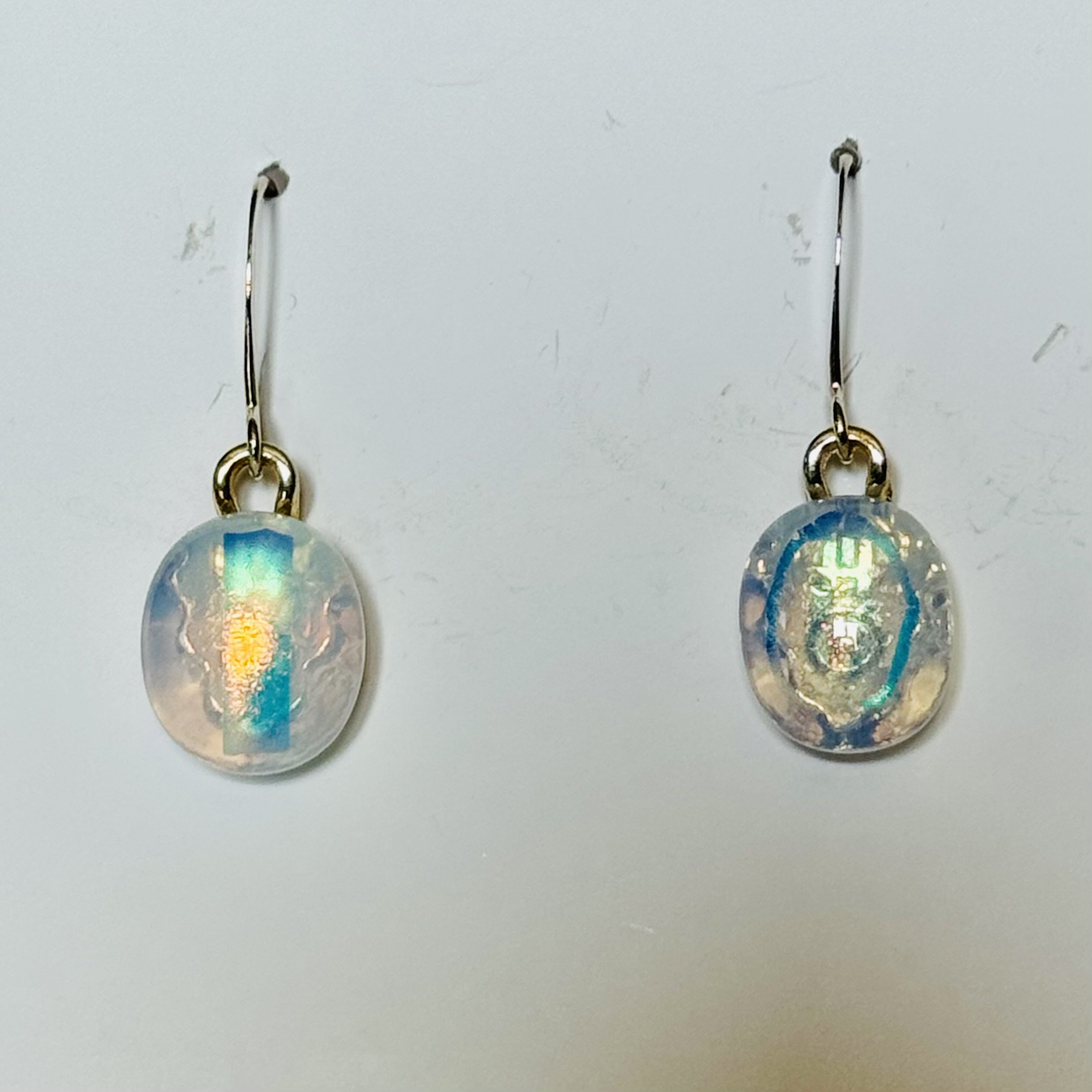Iridescent fused glass set on a sterling silver hook. as the light changes it catches silver, ans blue hues. It hangs approximately 1 ½ inch long.