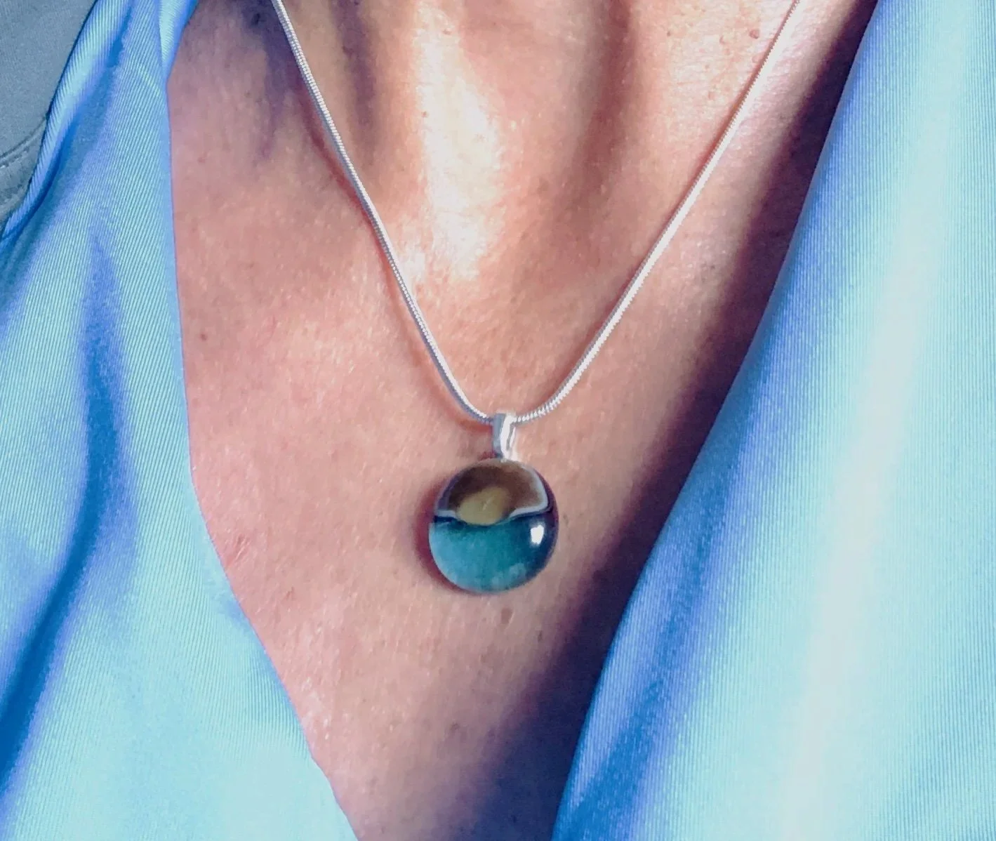 Pendants Categories: All sculpture Hearts Pendants Small dish Soap dish Lights Ornaments Bowls Rings Coasters Platters Small Dishes Plates Earrings Bar Assesories All / Pendants Pearl white glass cross with a 24 kt gold rim $45.00 Silver Round Pendant hangs from leather like cord $65.00 Teardrop Knot Silver Necklace with silver chain $75.00 Silver and gold glass pendant with chain $34.00 Petrified Wood with Egg Robin glass pendant $34.00 White on White glass pendant $34.00 Turquoise blue and petrified wood fused glass pendant $34.00